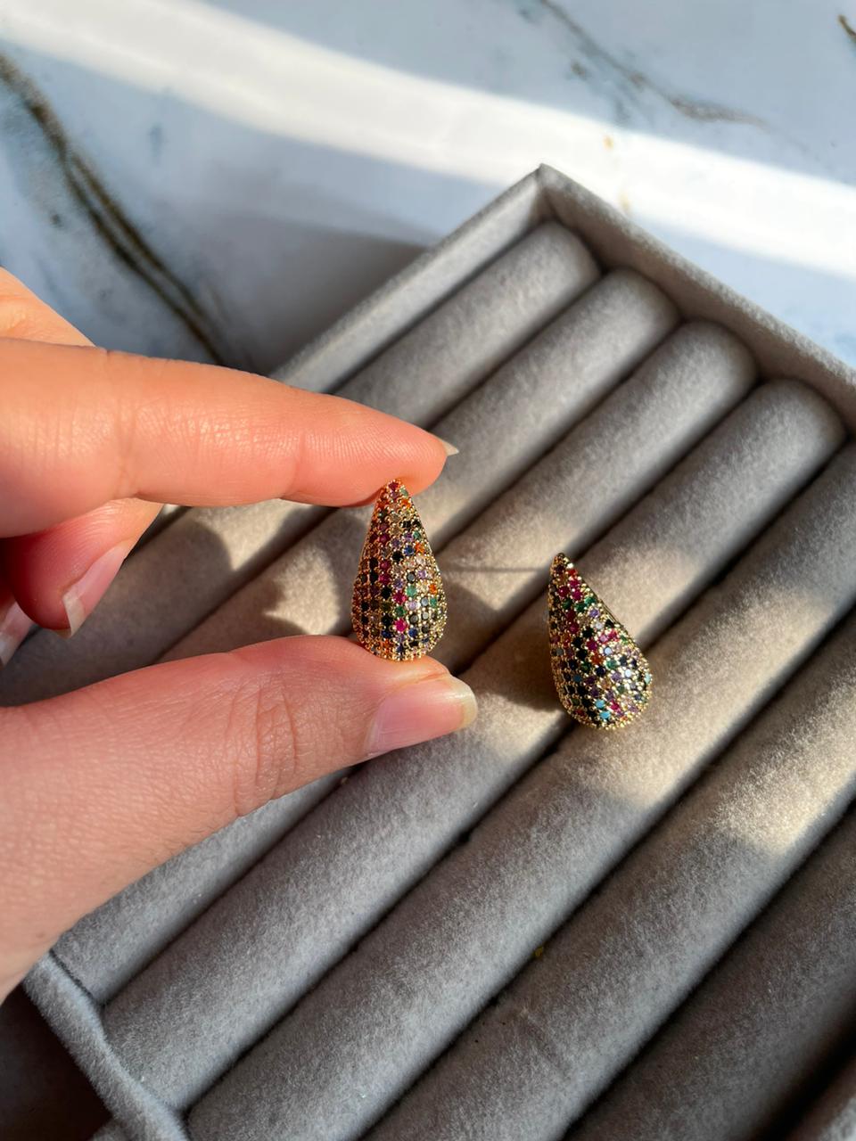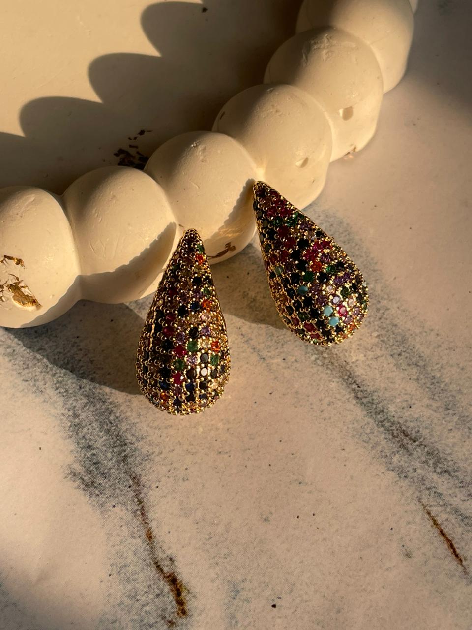 Meet your new vibrant favourites—drop-shaped earrings in a cascade of multicoloured crystals for a bold, eye-catching look. Crafted in 18k gold-plated stainless steel, they’re lightweight, hypoallergenic, and perfect for adding effortless sparkle to any outfit.