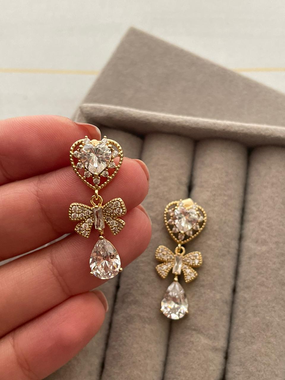 Add playful elegance with these earrings featuring a sparkling crystal heart, delicate bow, and graceful drop. Crafted in 18k gold-plated stainless steel, they’re lightweight, hypoallergenic, and perfect for adding a whimsical, feminine touch to any outfit.