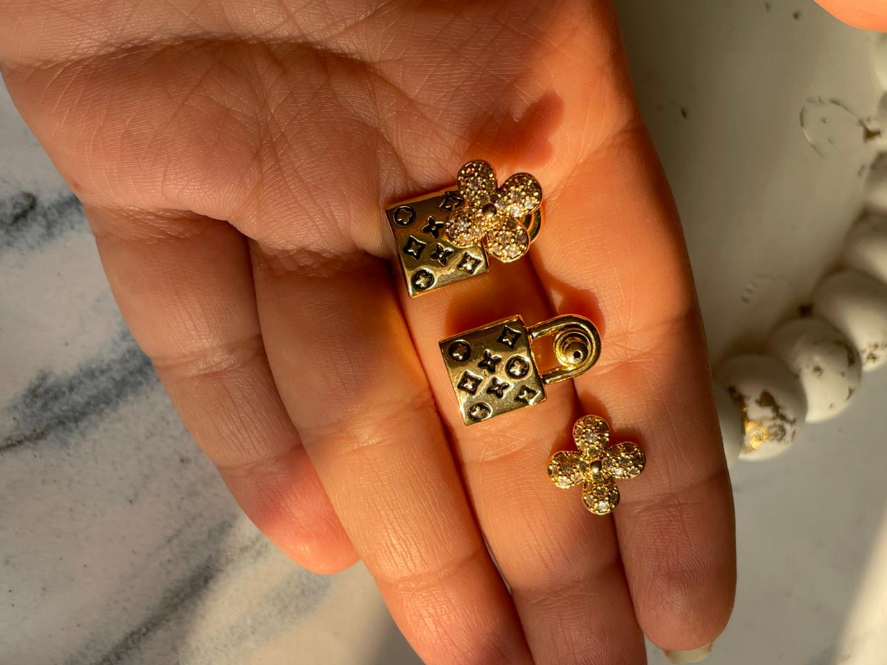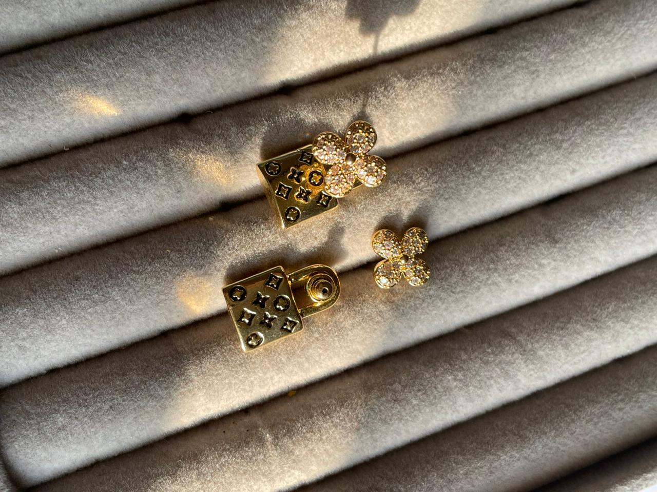 Playful and chic, these earrings feature sparkling clover crystal studs in front with a charming bag-shaped back. Crafted in 18k gold-plated stainless steel, they’re lightweight, hypoallergenic, and full of whimsical flair.
