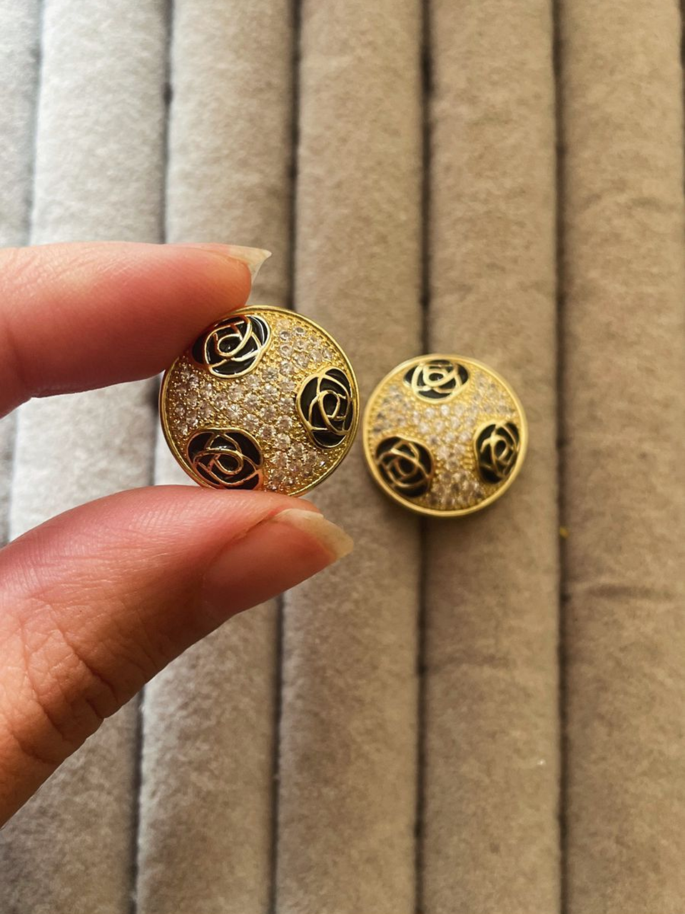 Meet your new chic essentials—round crystal studs detailed with three petite black flowers for a striking, modern contrast. Crafted in 18k gold-plated stainless steel, they’re lightweight, hypoallergenic, and perfect for everyday sparkle.