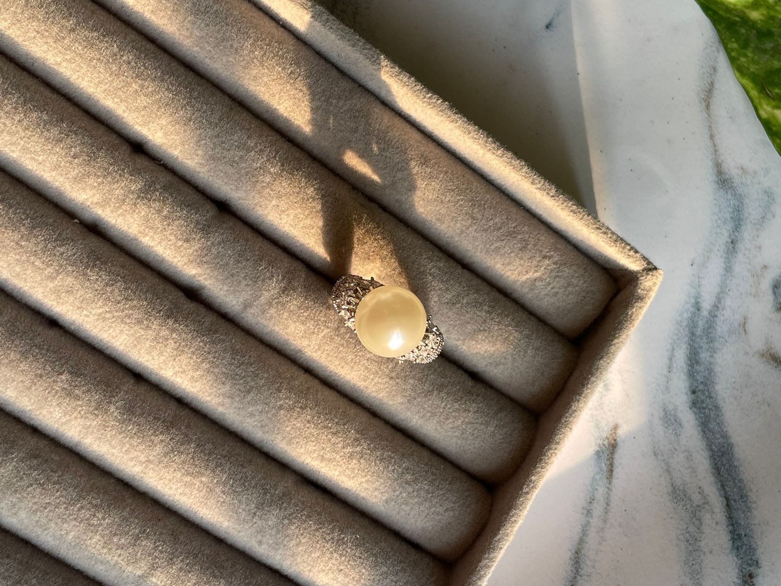 a silver-toned ring featuring a statement pearl surrounded by delicate crystals for a touch of timeless elegance. Crafted in 18k gold-plated stainless steel, it’s lightweight, hypoallergenic, and perfect for elevating any outfit.