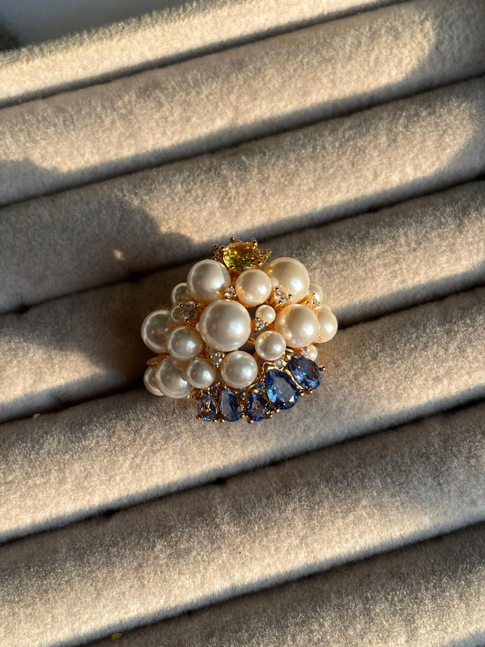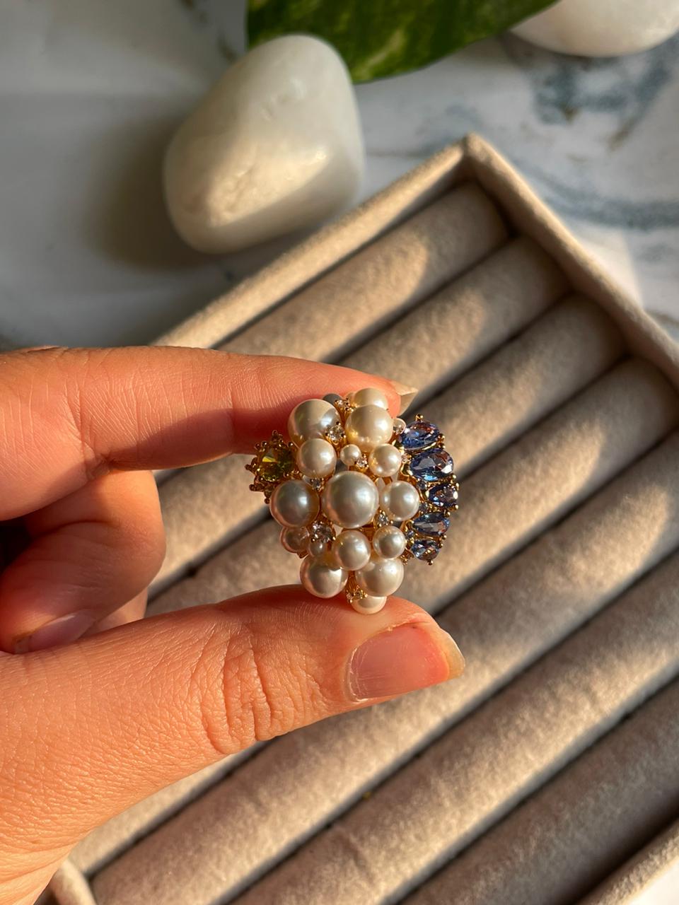 Meet your new statement favourite—a chunky cluster ring featuring lustrous pearls accented with vibrant blue and yellow crystals. Crafted in 18k gold-plated stainless steel, it’s lightweight, hypoallergenic, and perfect for adding bold, playful glamour to any outfit.