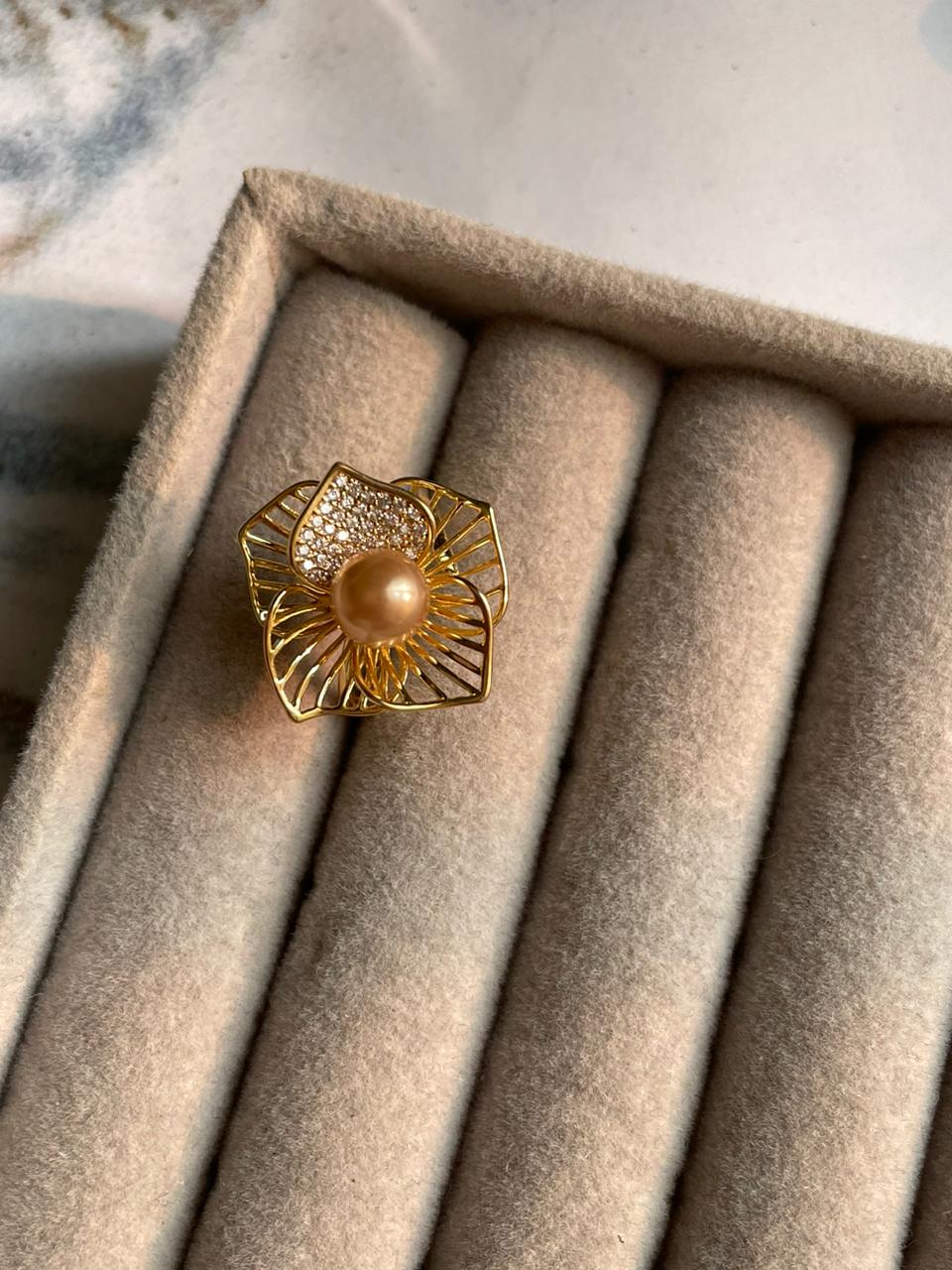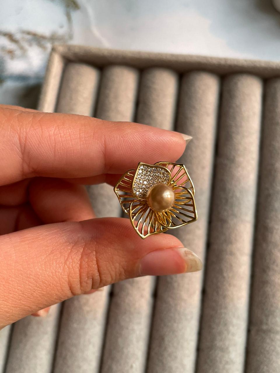 Add a touch of feminine charm with this flower-shaped ring featuring a lustrous pearl at its centre. Crafted in 18k gold-plated stainless steel, it’s lightweight, hypoallergenic, and perfect for adding delicate elegance to any outfit.