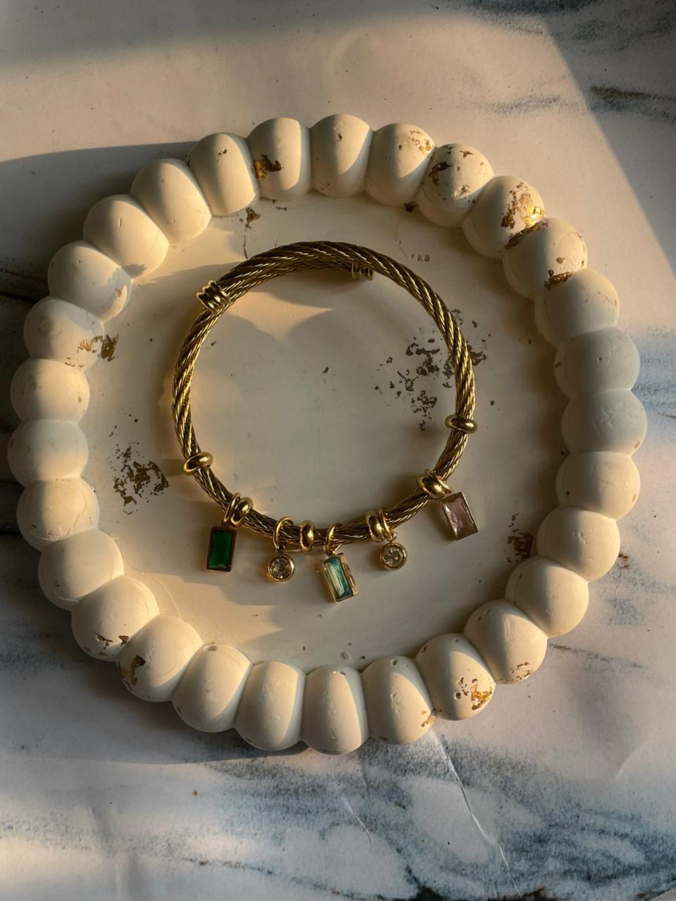 Brighten your look with this bracelet adorned with sparkling multicoloured crystals. Crafted in 18k gold-plated stainless steel, it’s lightweight, hypoallergenic, and perfect for adding a pop of colour to any outfit.